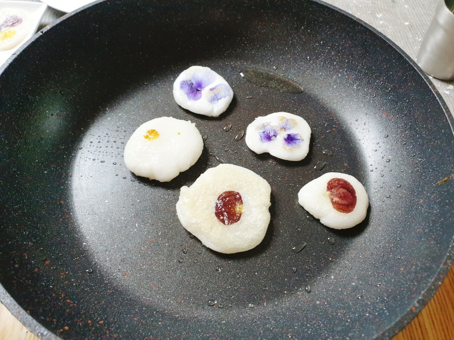 - 꽃 올리기: 한쪽 면이 익으면 뒤집고 팬지를 위에 올린 후 살짝 눌러 고정시킵니다.